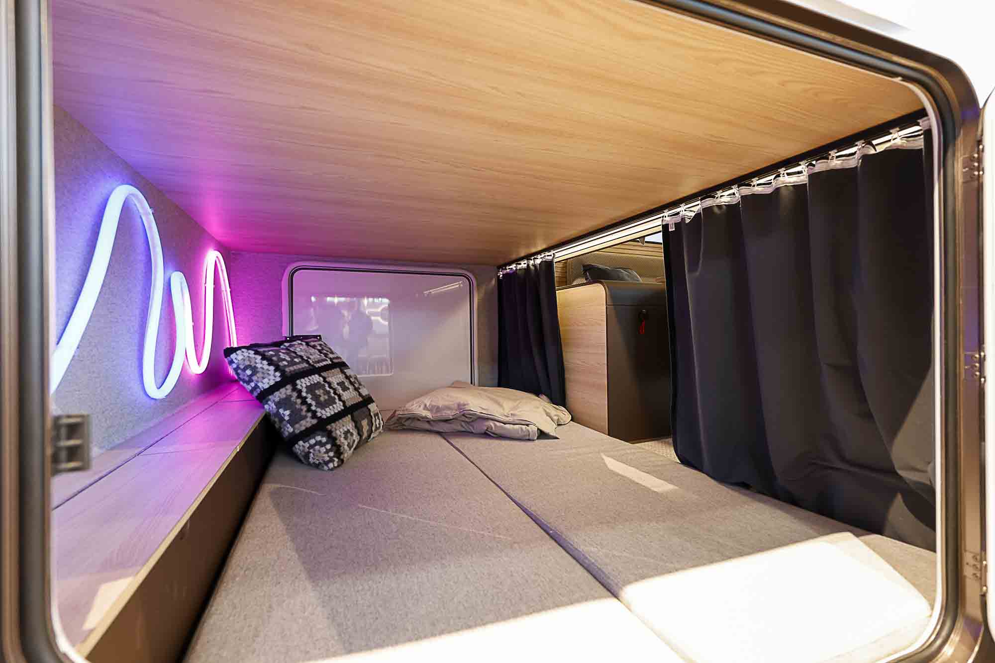 Pour optimiser l’espace disponible dans son petit volume, la Talis propose des systèmes d’extension comme le Air-Xtension. Ce dernier agrandit l’espace de nuit en transformant le lit transversal fixe en un lit longitudinal de 200 x 170 cm lorsqu’il est déployé. Outre cette extension du volume intérieur avec ce système de soufflet inspiré de celui qui équipe d’ores et déjà le camping-car Lyseo TD Gallery, la Talis emprunte nombre d’idées au monde des vans (ou du nautisme) habitué à maximiser l’usage qu’il fait de l’espace. On trouve ainsi un lit pour les enfants sous le lit transversal. Cette « chambre » enfant peut être utilisée comme rangement pendant le trajet, de nombreux rangements modulables, un module de cuisine portable pouvant être utilisé en extérieur ou encore une banquette amovible dans le salon.