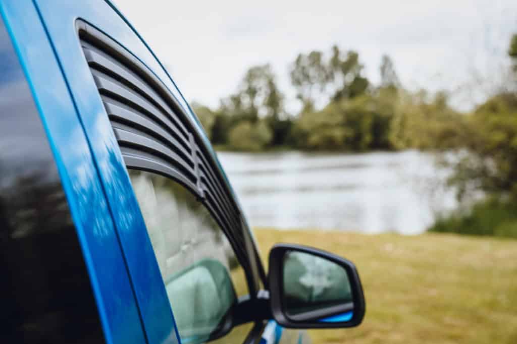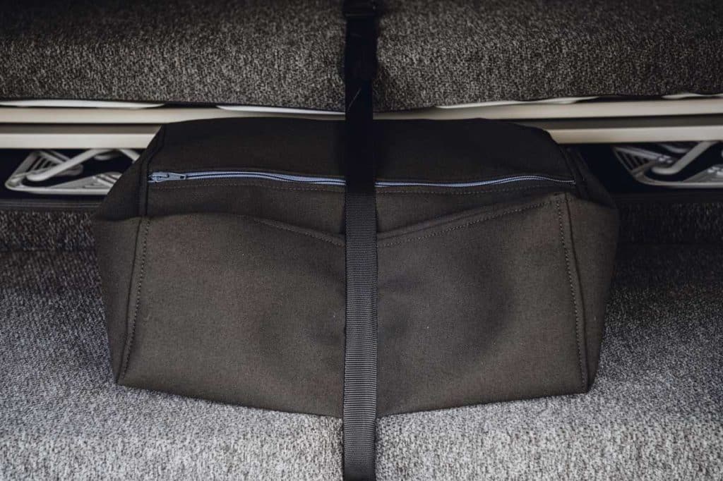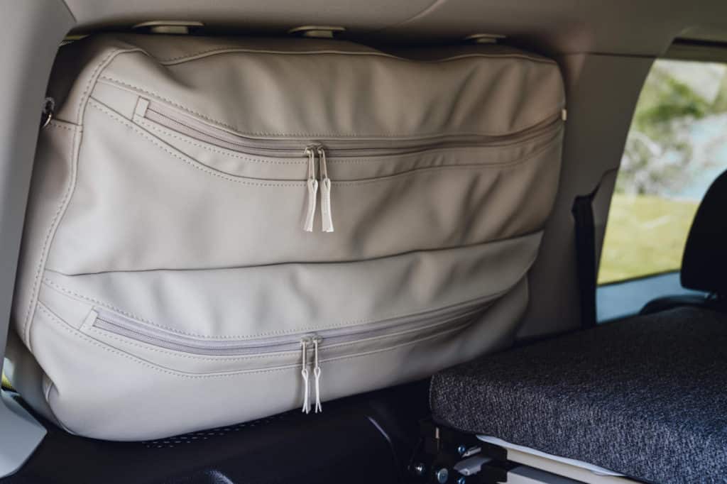 Il y a une petite cuisine coulissante qui se verrouille en position pour être utilisée avec le hayon ouvert. Elle comprend un brûleur à gaz unique et un plan de travail, ainsi que, au niveau inférieur, un plateau à couverts et des rangements pour les casseroles et les assiettes. Il faut vraiment faire preuve d’ingéniosité avec un petit camping-car, et j’apprécie particulièrement les équipements tels que les mini-sacs à fermeture éclair pour les vêtements qui se fixent aux fenêtres latérales arrière. Mais il reste également très proche d’une voiture, notamment grâce à ses cinq sièges de voyage, dont les trois à l’arrière sont amovibles, ce qui facilite le rangement si vous n’êtes que deux à partir en camping dans ce véhicule.