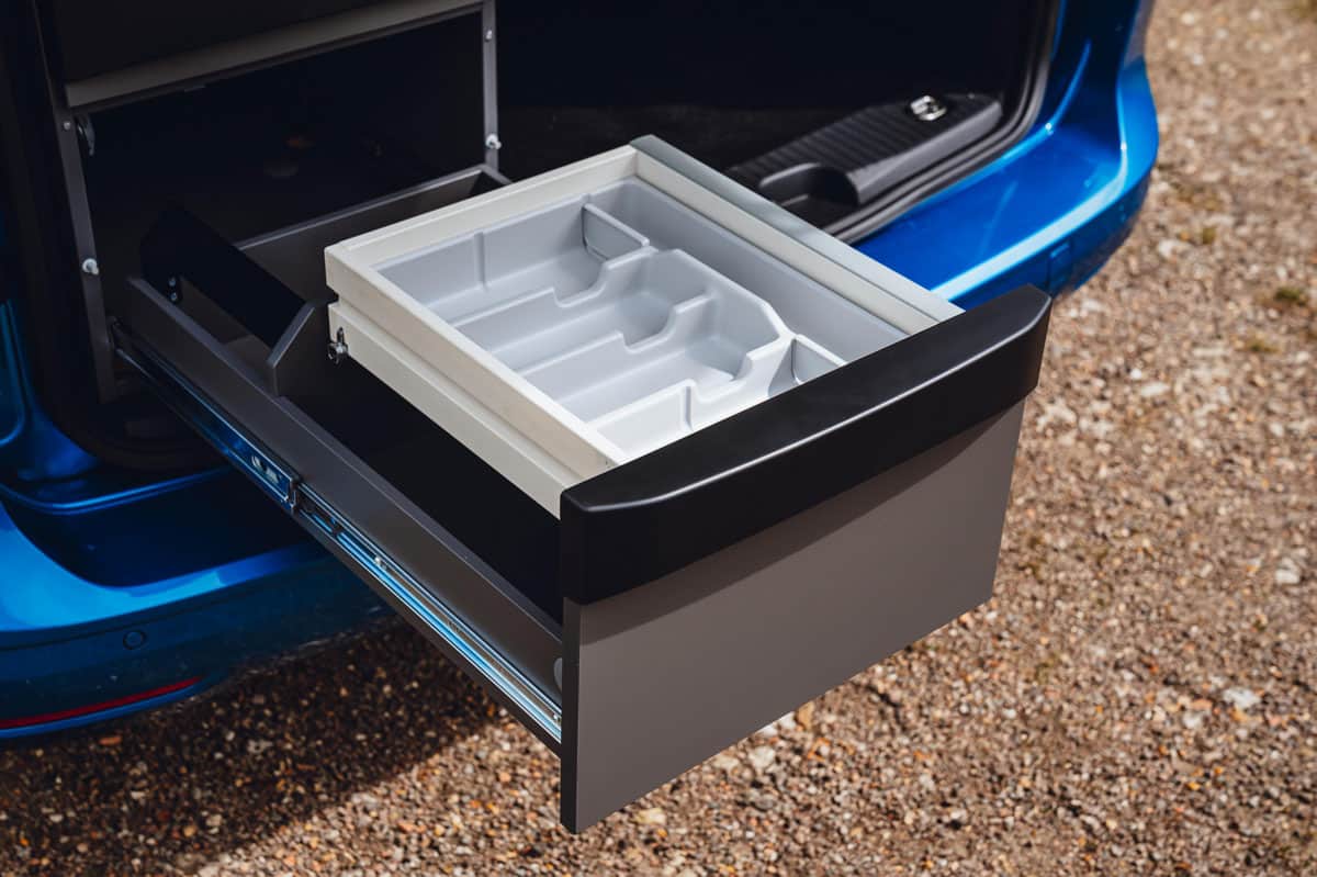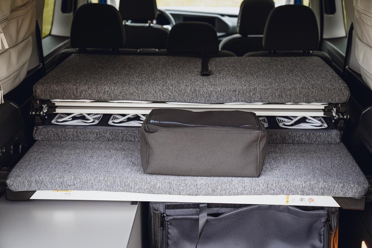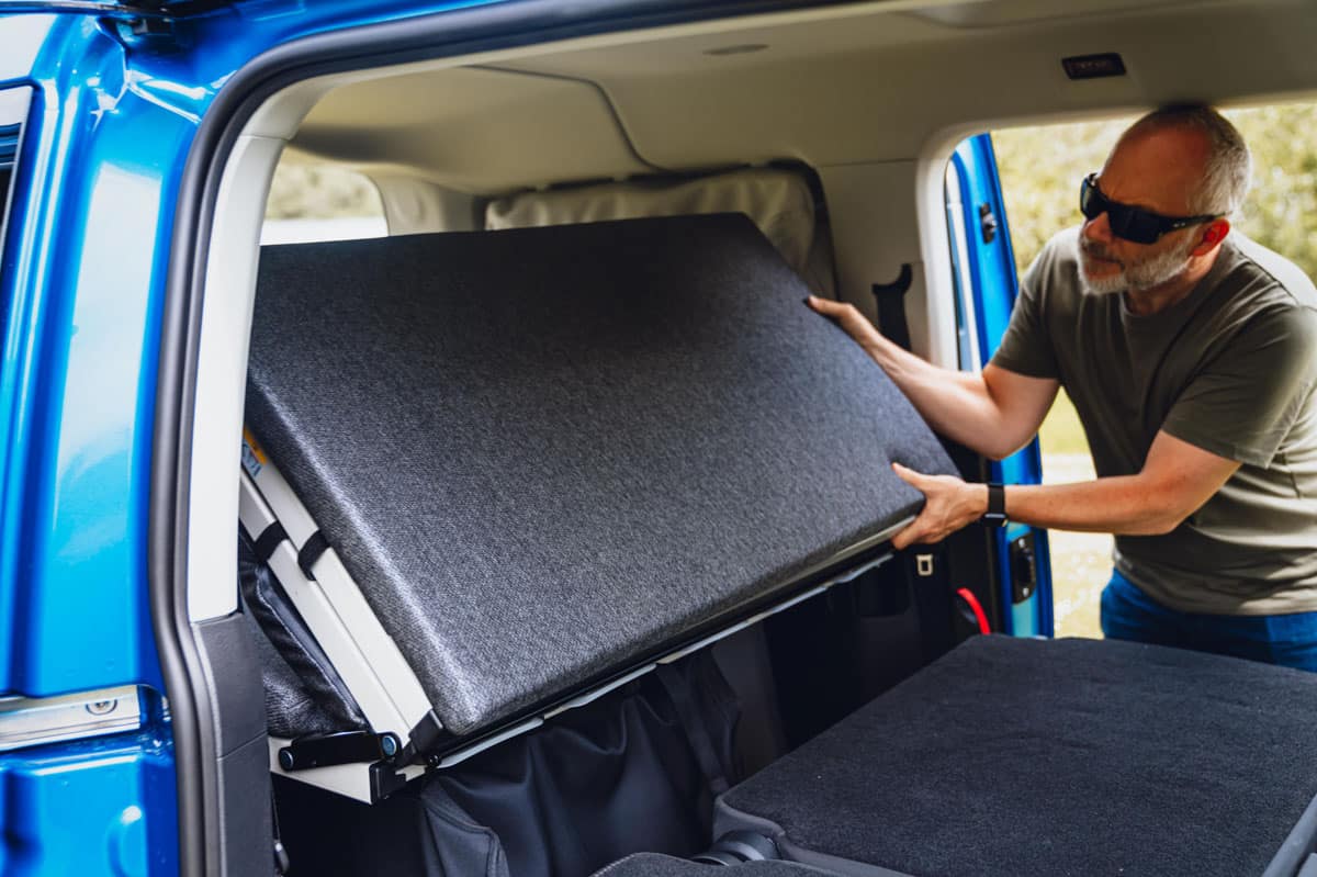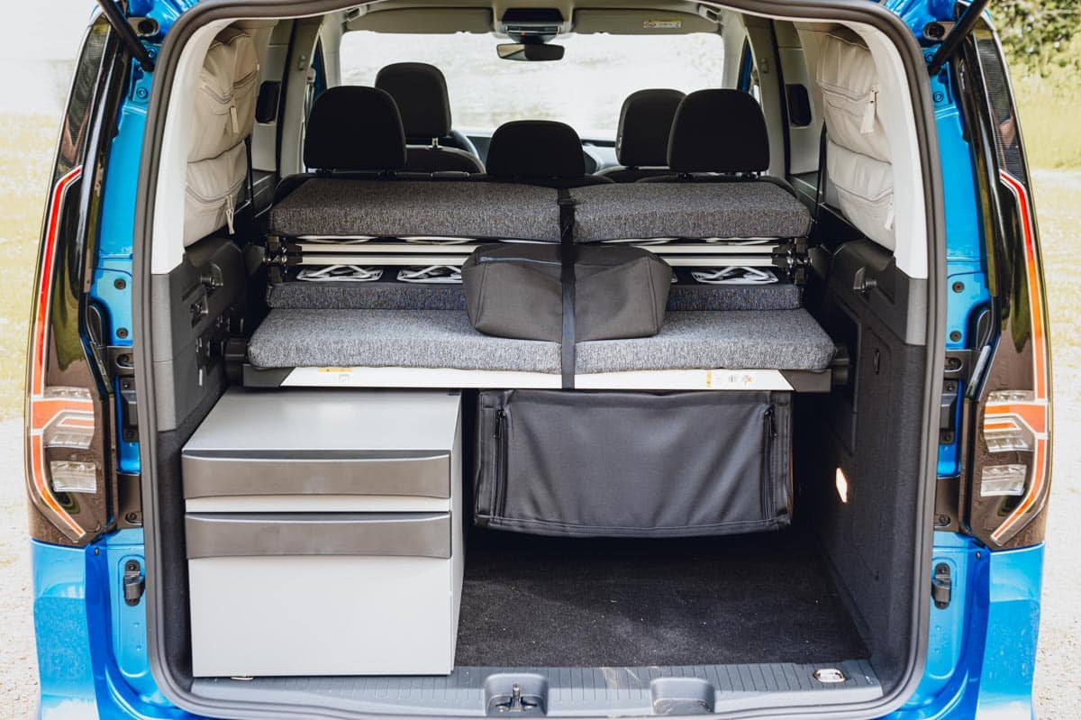 La dernière extension de la marque California de Volkswagen utilise son monospace Caddy qui, à son tour, est fabriqué sur une plateforme de voiture Golf. Donc, oui, il est vraiment agréable à conduire, mais il offre également un certain nombre d’équipements de camping à bord. Le plus impressionnant est le grand lit double (1,98 m x 1,07 m) qui se replie à plat une fois que vous avez dégagé les sièges arrière. Il est solide et extrêmement confortable – on pourrait croire qu’il ne s’agit que d’un mince matelas, mais il y a des supports à ressorts en plastique.