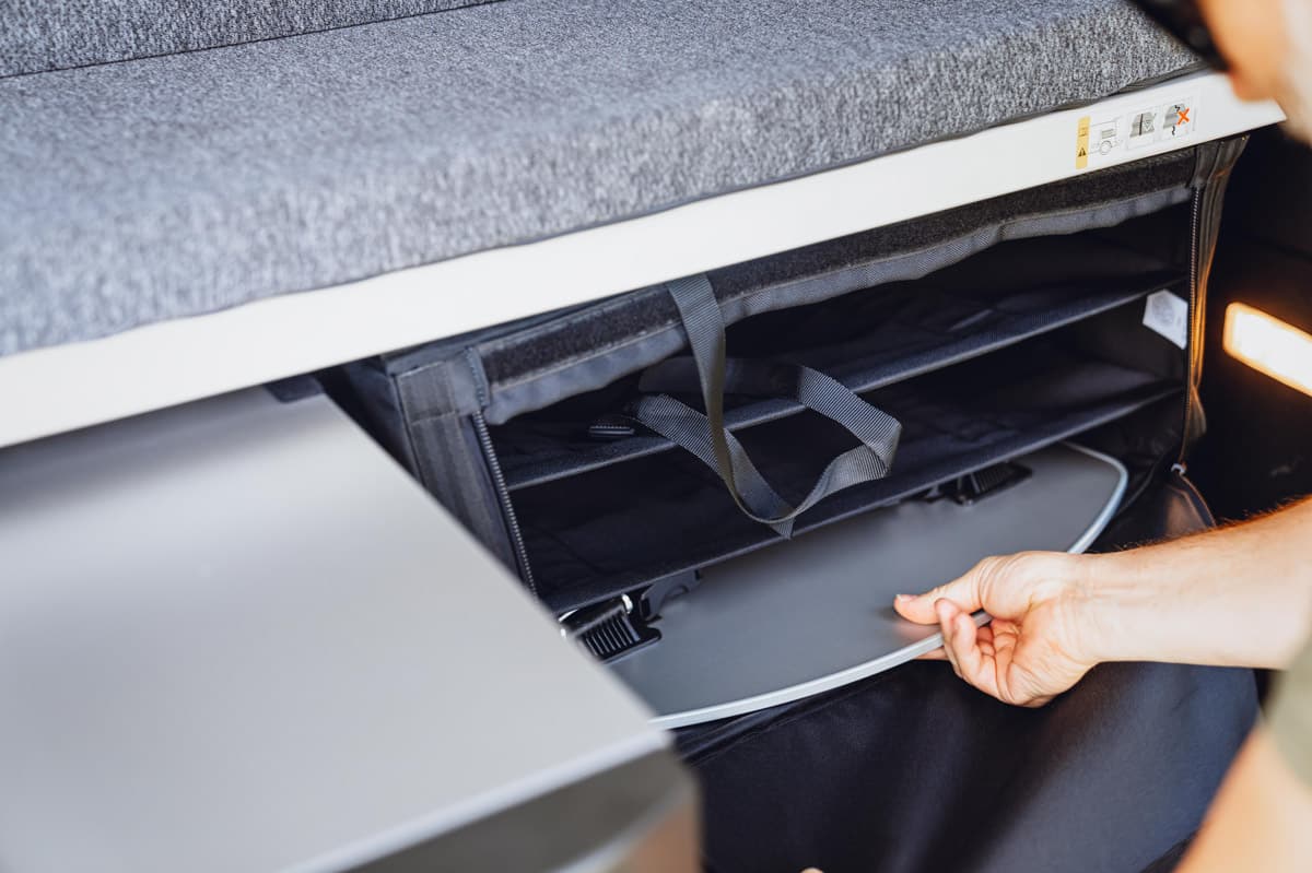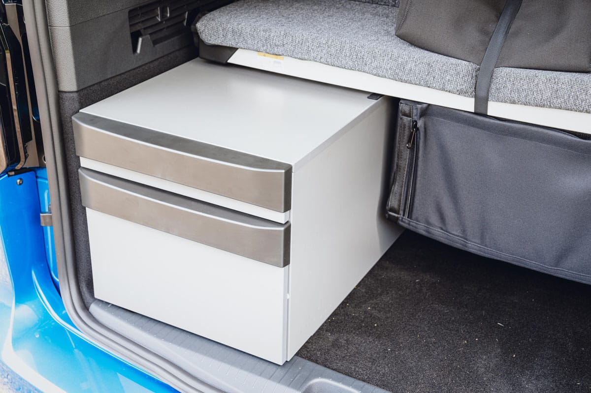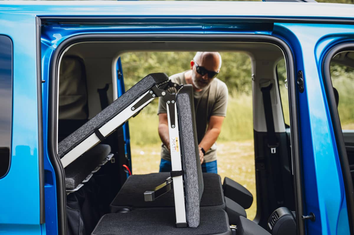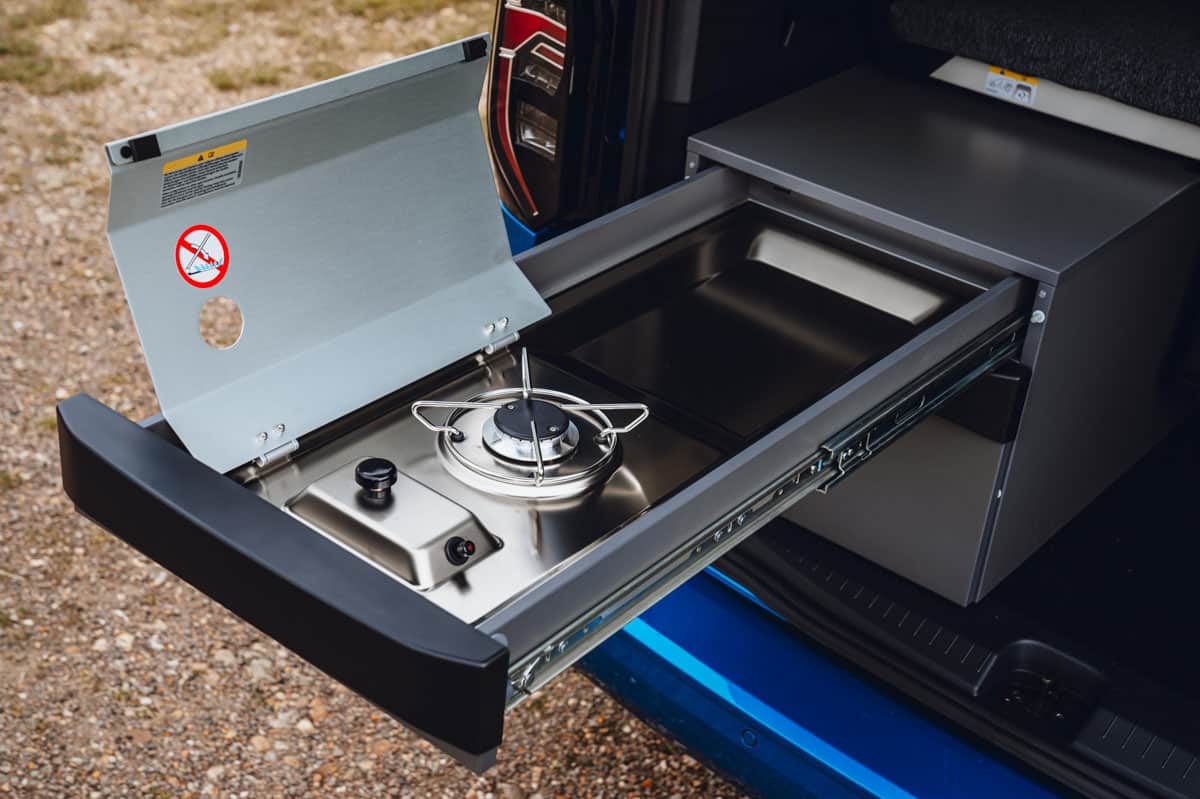 La dernière extension de la marque California de Volkswagen utilise son monospace Caddy qui, à son tour, est fabriqué sur une plateforme de voiture Golf. Donc, oui, il est vraiment agréable à conduire, mais il offre également un certain nombre d’équipements de camping à bord. Le plus impressionnant est le grand lit double (1,98 m x 1,07 m) qui se replie à plat une fois que vous avez dégagé les sièges arrière. Il est solide et extrêmement confortable – on pourrait croire qu’il ne s’agit que d’un mince matelas, mais il y a des supports à ressorts en plastique.