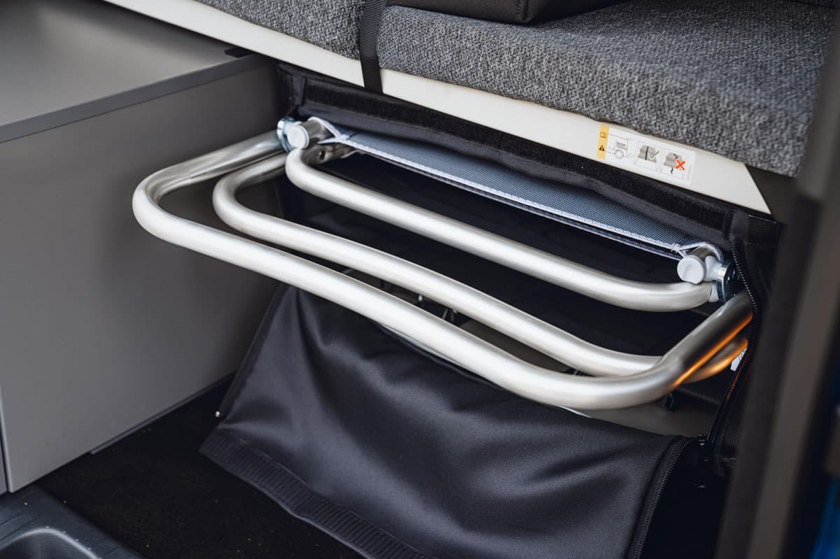 De plus, comme toutes ses grandes sœurs californiennes, il est livré avec deux chaises pliantes et une table sur pied pour l’extérieur. Ils se rangent tous dans un sac zippé fixé sous le siège de voyage arrière.