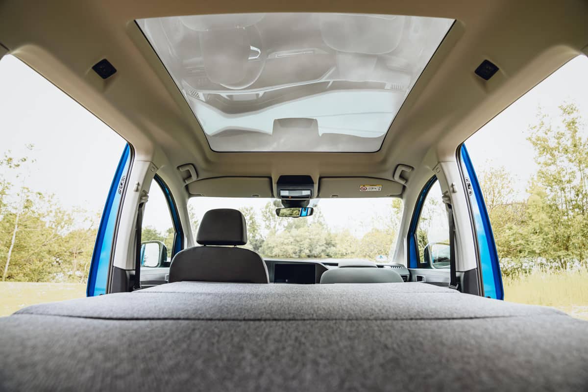 Il y a une petite cuisine coulissante qui se verrouille en position pour être utilisée avec le hayon ouvert. Elle comprend un brûleur à gaz unique et un plan de travail, ainsi que, au niveau inférieur, un plateau à couverts et des rangements pour les casseroles et les assiettes. Il faut vraiment faire preuve d’ingéniosité avec un petit camping-car, et j’apprécie particulièrement les équipements tels que les mini-sacs à fermeture éclair pour les vêtements qui se fixent aux fenêtres latérales arrière. Mais il reste également très proche d’une voiture, notamment grâce à ses cinq sièges de voyage, dont les trois à l’arrière sont amovibles, ce qui facilite le rangement si vous n’êtes que deux à partir en camping dans ce véhicule.