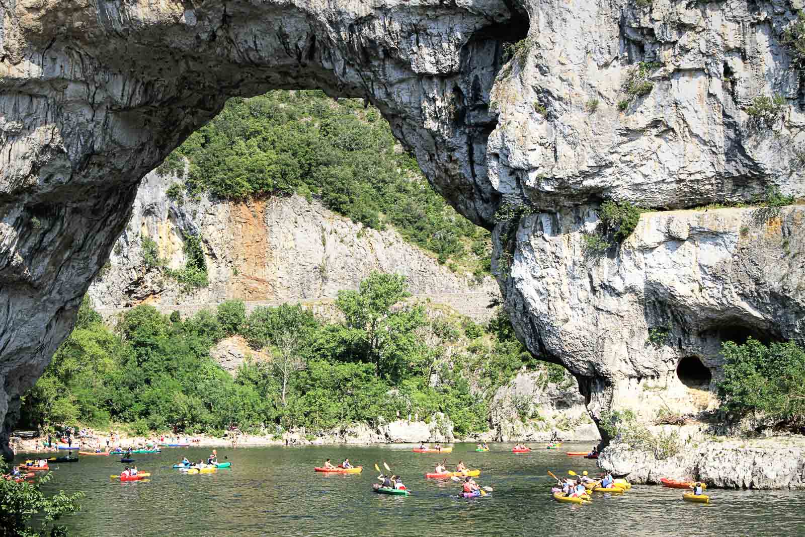 Il existe bien des façons de visiter les Gorges de l’Ardèche. Depuis la route touristique, ponctuée de belvédères, on apprécie déjà la beauté des falaises calcaires, mais c’est toutefois du fond des gorges que l’on profite le mieux de l’impressionnante verticalité de ce site exceptionnel. Et pour cela, rien ne vaut le canoë ou le kayak. La sortie en canoë est d’ailleurs devenue un des grands classiques de tout bon séjour ardéchois. Le nombre de canoë qui fréquentent l’Ardèche flirte avec les 100.000 embarcations annuelles. Autant dire qu’à certaine période l’Ardèche n’est pas sans évoquer un centre commercial un samedi après-midi de solde. Si vous pouvez choisir, les mois de mai et juin demeurent la meilleure période pour descendre l’Ardèche en canoë. Les eaux sont encore suffisamment hautes et l’on échappe à l’affluence estivale.