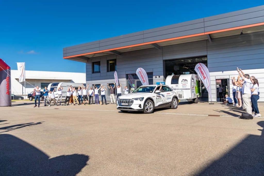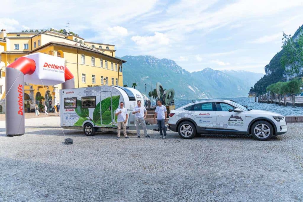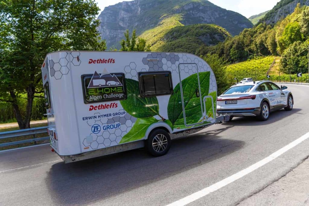 L’itinéraire qui va de la région d’Allgaü, siège de Dethleffs, jusqu’au lac de Garde via le col de Brenner est bien connu des caravaniers allemands qui partent en camping en Italie. Cette route de 386 kilomètres, qui demande environ 6 heures, a donc été choisie pour mettre au défi cet attelage 100% électrique composé de la caravane E.Home et d’une Audi e-Tron. Avec ou sans caravane, Audi annonçait une autonomie guère supérieure aux 386 kilomètres prévus. Autant dire que sans l’assistance électrique de la caravane, l’attelage n’aurait jamais pu rallier le lac de Garde.