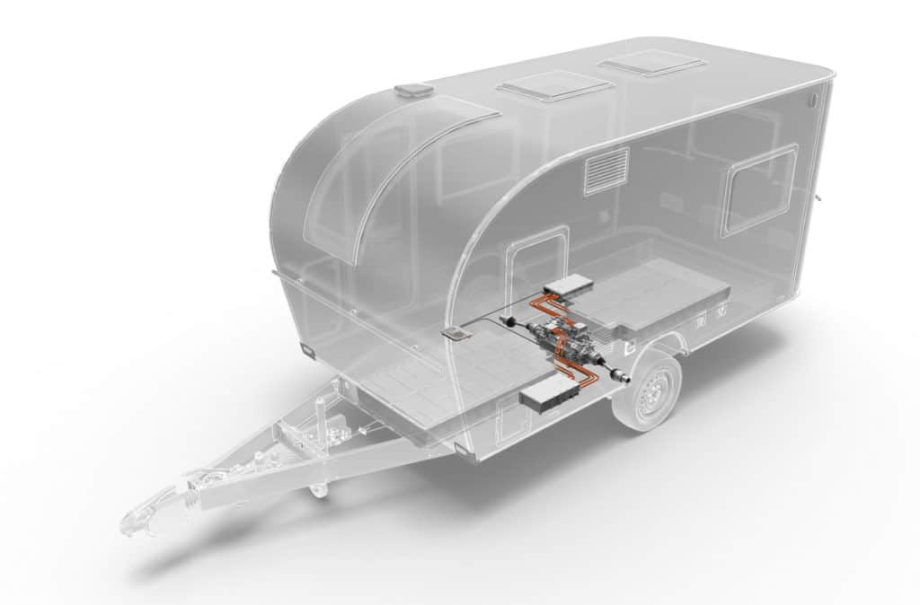 Présentée pour la première fois au salon de Düsseldorf 2019, la caravane E.Home est une idée originale. Le concept de cette caravane électrique consiste à soulager la voiture tractrice. La caravane tractée n’est plus un poids mort, mais une caravane motrice grâce à son propre module de traction 100% électrique. Les deux moteurs électriques à moyeu de la caravane E.Home transforment donc une remorque passive en un véhicule habitable actif. Ainsi, lorsqu’elle est tractée, les deux moteurs de la caravane réduisent la charge imputée à la voiture. Ces deux moteurs offrent, en outre, plusieurs avantages comme la possibilité de se garer via une application à distance ou d’effectuer une rotation à 360° avec la caravane. Plus besoin de mover, donc. Pour alimenter cette caravane électrique, une installation photovoltaïque sur le toit de la E.Home maximise son autonomie. D’autant que les deux moteurs récupèrent également de l’énergie dans les descentes.