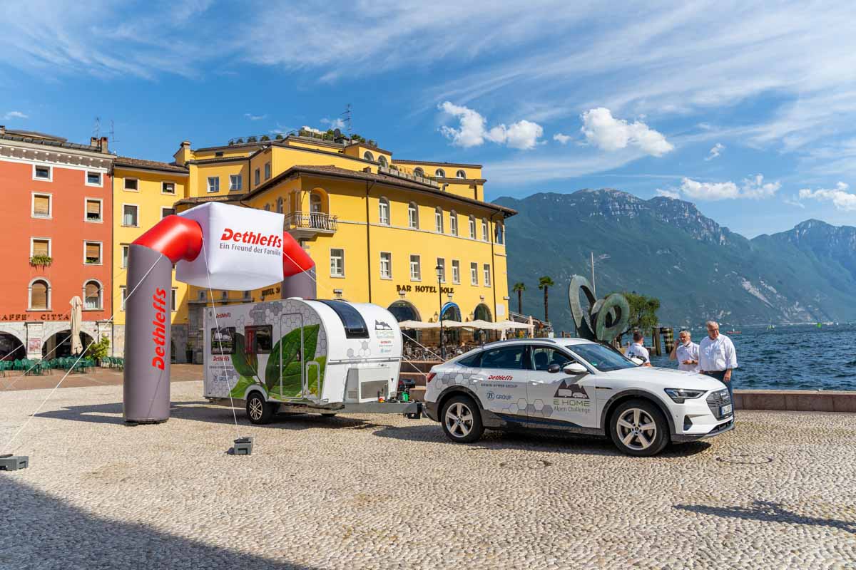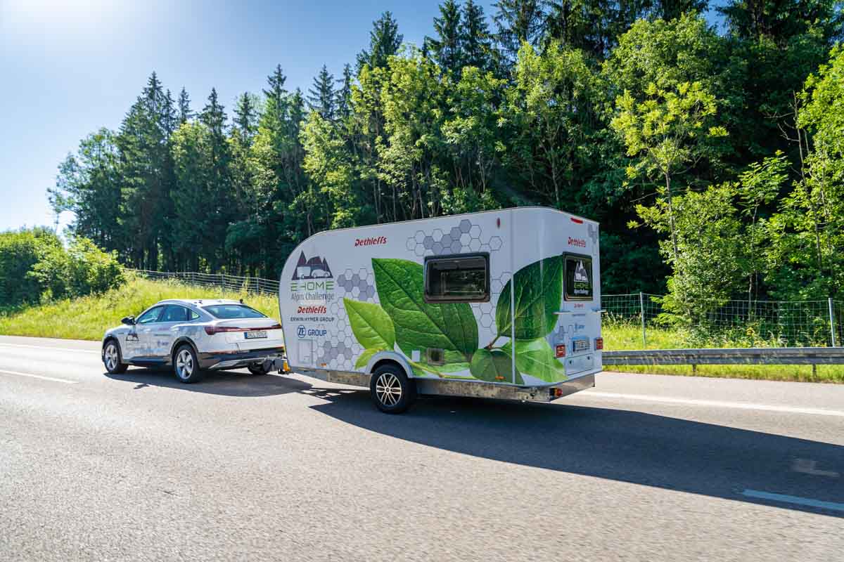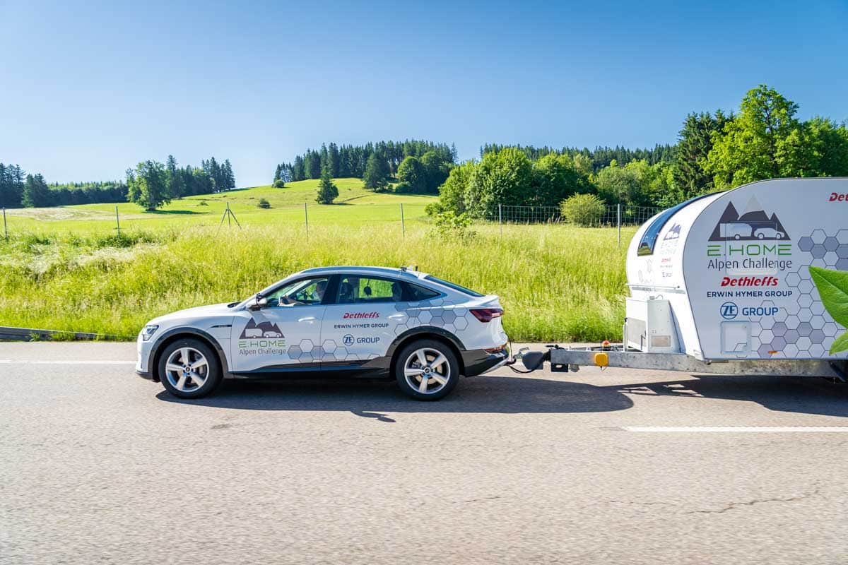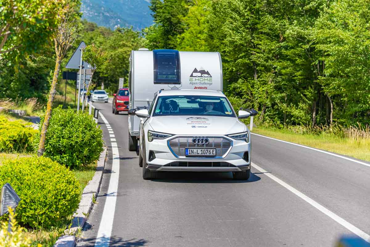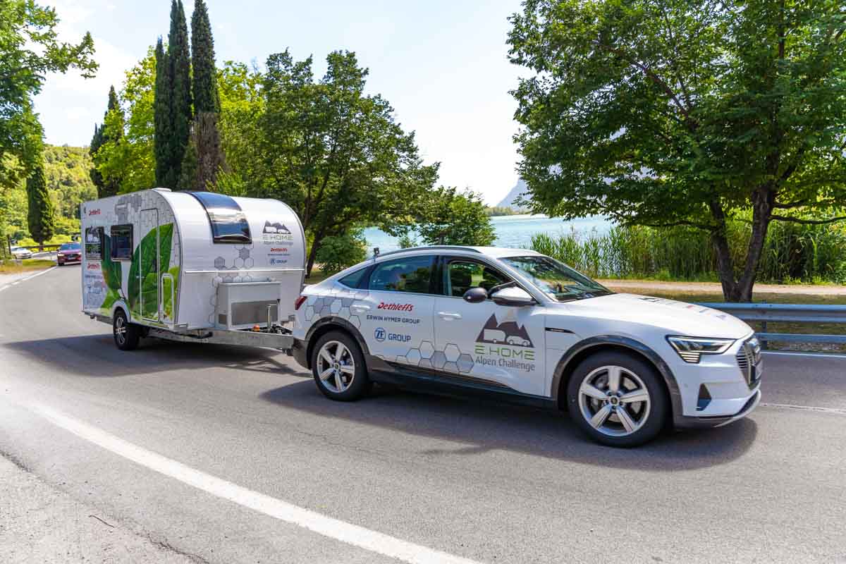 L’itinéraire qui va de la région d’Allgaü, siège de Dethleffs, jusqu’au lac de Garde via le col de Brenner est bien connu des caravaniers allemands qui partent en camping en Italie. Cette route de 386 kilomètres, qui demande environ 6 heures, a donc été choisie pour mettre au défi cet attelage 100% électrique composé de la caravane E.Home et d’une Audi e-Tron. Avec ou sans caravane, Audi annonçait une autonomie guère supérieure aux 386 kilomètres prévus. Autant dire que sans l’assistance électrique de la caravane, l’attelage n’aurait jamais pu rallier le lac de Garde.