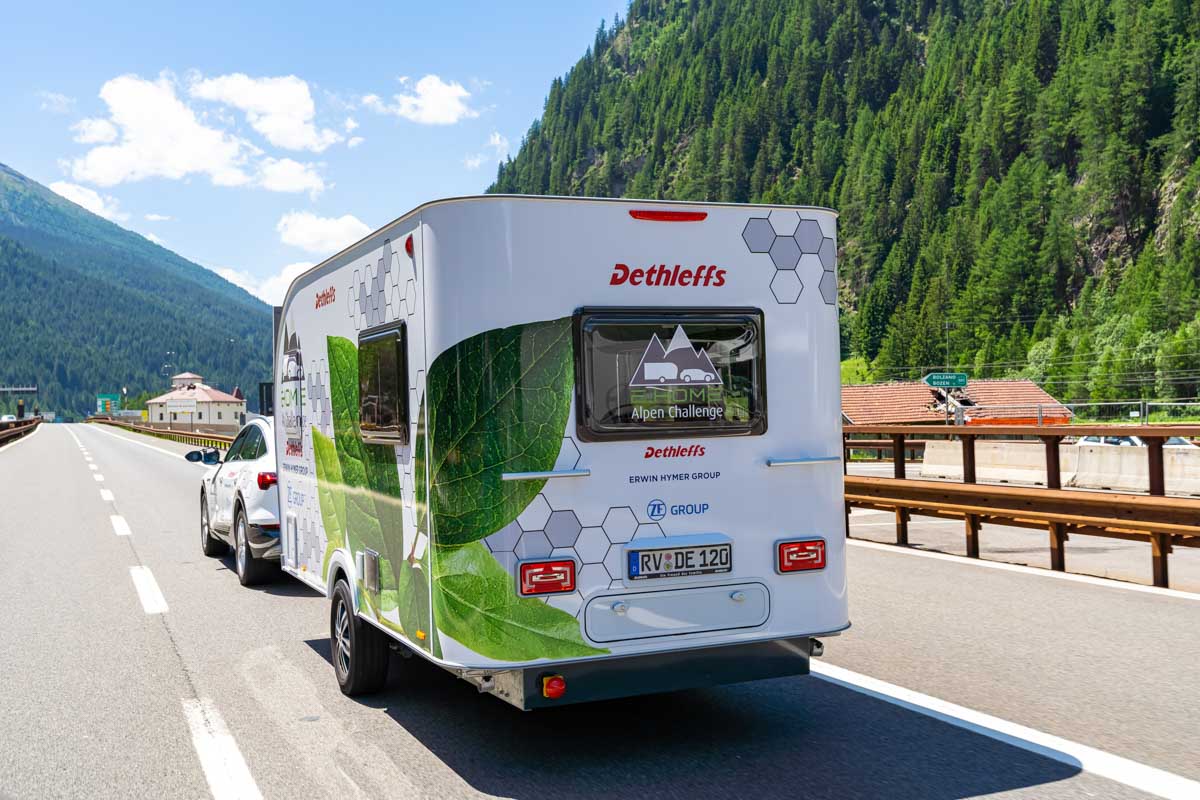 Ceux qui sont déjà parti en camping dans les Alpes avec une caravane savent bien que les dénivelés alpins augmentent fortement la consommation du véhicule. Avec une voiture classique, la seule conséquence est de faire quelques étapes supplémentaires dans les stations services le long de votre parcours. Effectuer un tel trajet avec une voiture électrique tractant une caravane serait bien plus compliqué. Pour les équipes de Dethleffs, les Alpes se dressaient donc comme un test grandeur nature pour le protoype de la caravane E.Home .