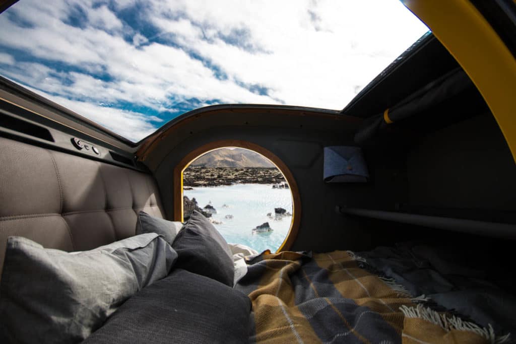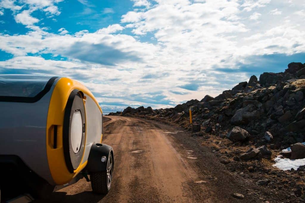 C’est tout d’abord par son esthétique que la Mink 2.0 séduit. Il faut dire qu’avec sa cellule jaune et grise aux courbes élégantes, ses portes arrondies comme des hublots et ses jantes en alliage, la petite islandaise a fière allure. Car, et ce n’est pas sa seul originalité, la Mink 2.0 a vu le jour au pays des volcans. Montée sur un châssis galvanisée Al-Ko qui lui assure stabilité pendant la route grâce à son centre de gravité très bas, la caravane affiche un poids de 520 kg pour un PTAC de 750 kg. Elle pourra donc être tractée par la plupart des voitures. Et sa hauteur de 1,83 mètres lui permet d’aisément passer sous la barre des 2 mètres au péage et donc de bénéficier du tarif de la catégorie 1. L’habitacle monocoque semble solide et prévu pour durer.