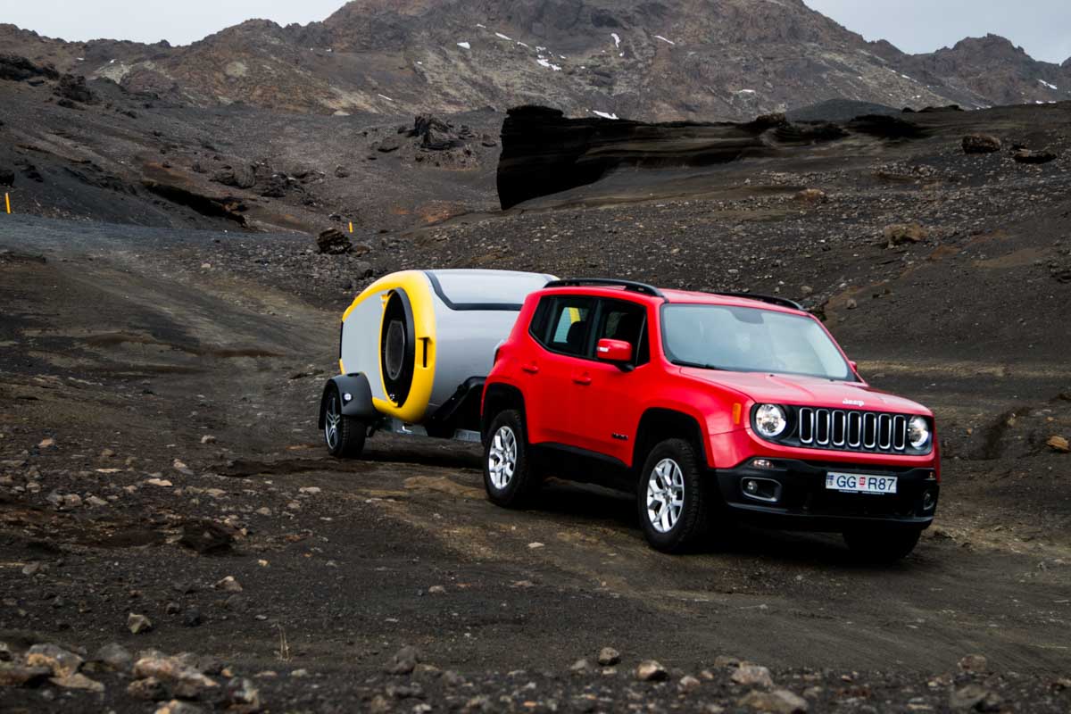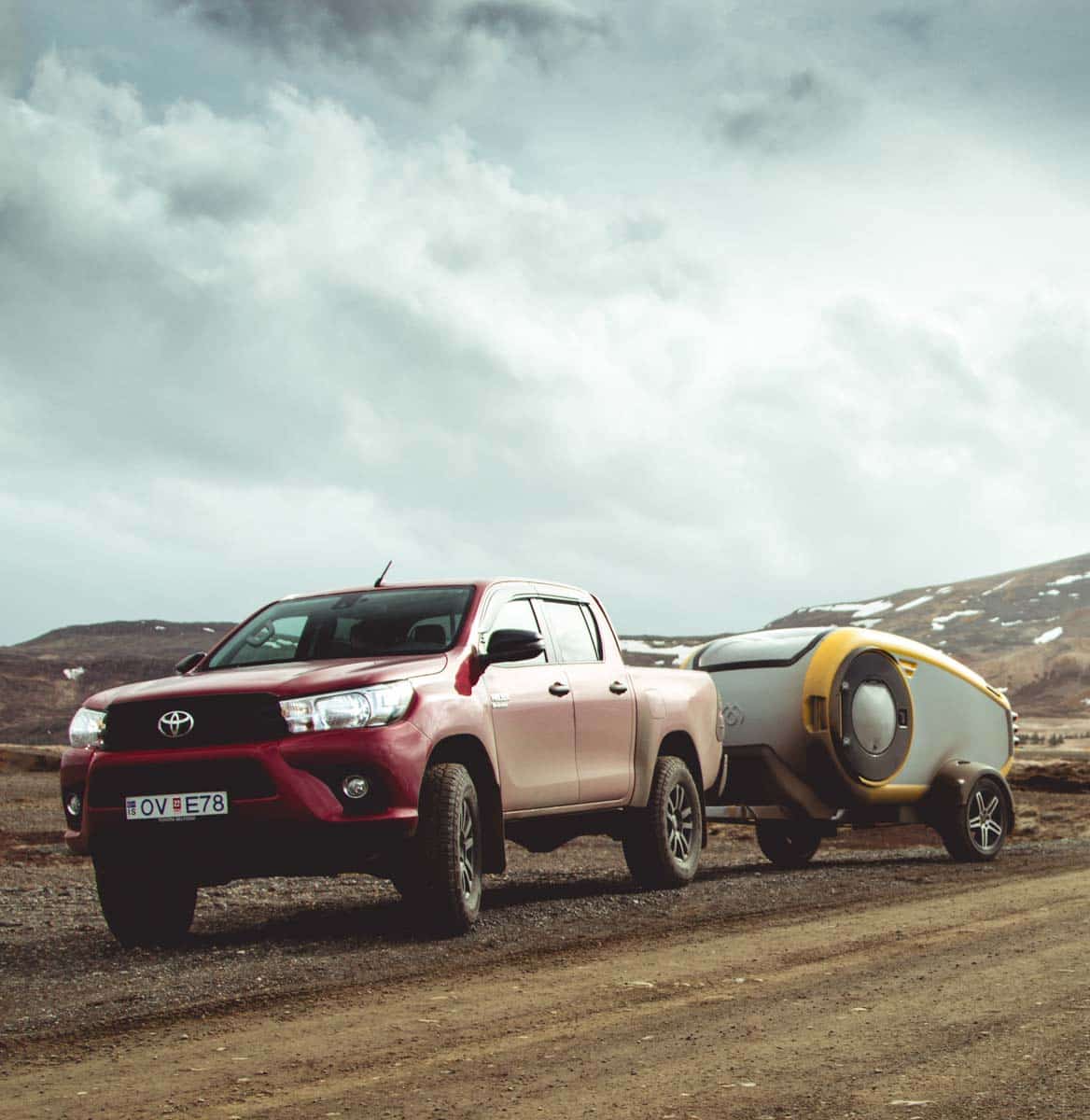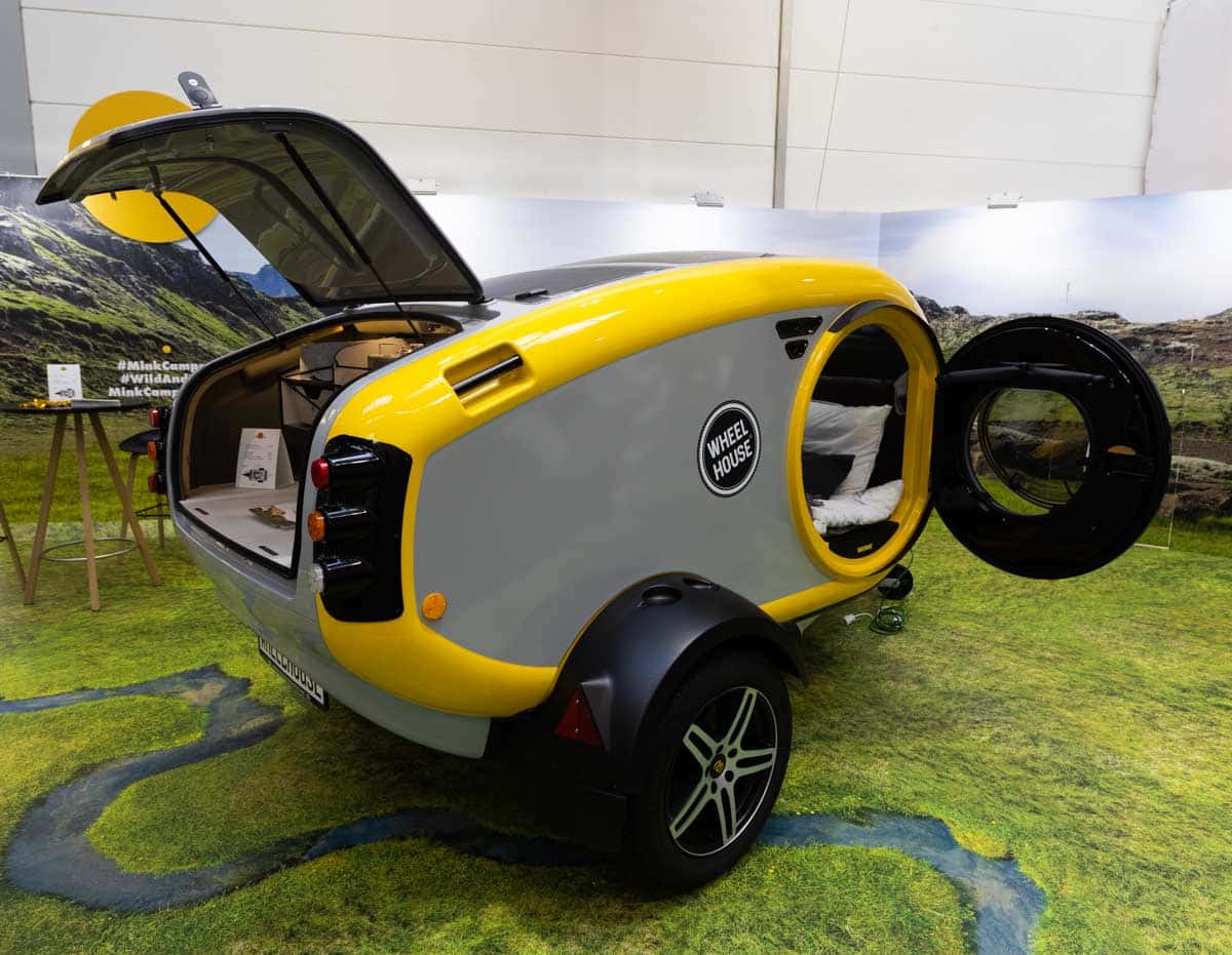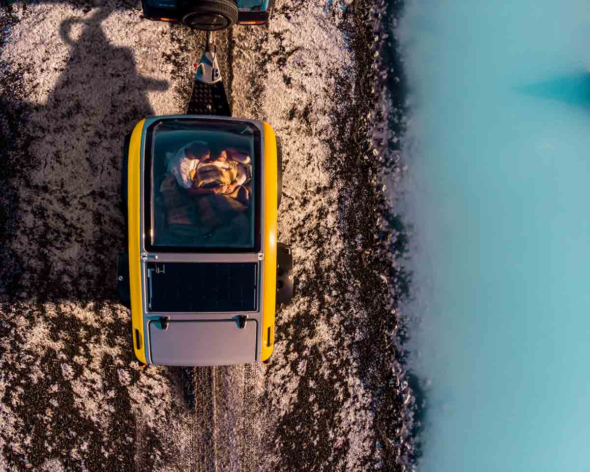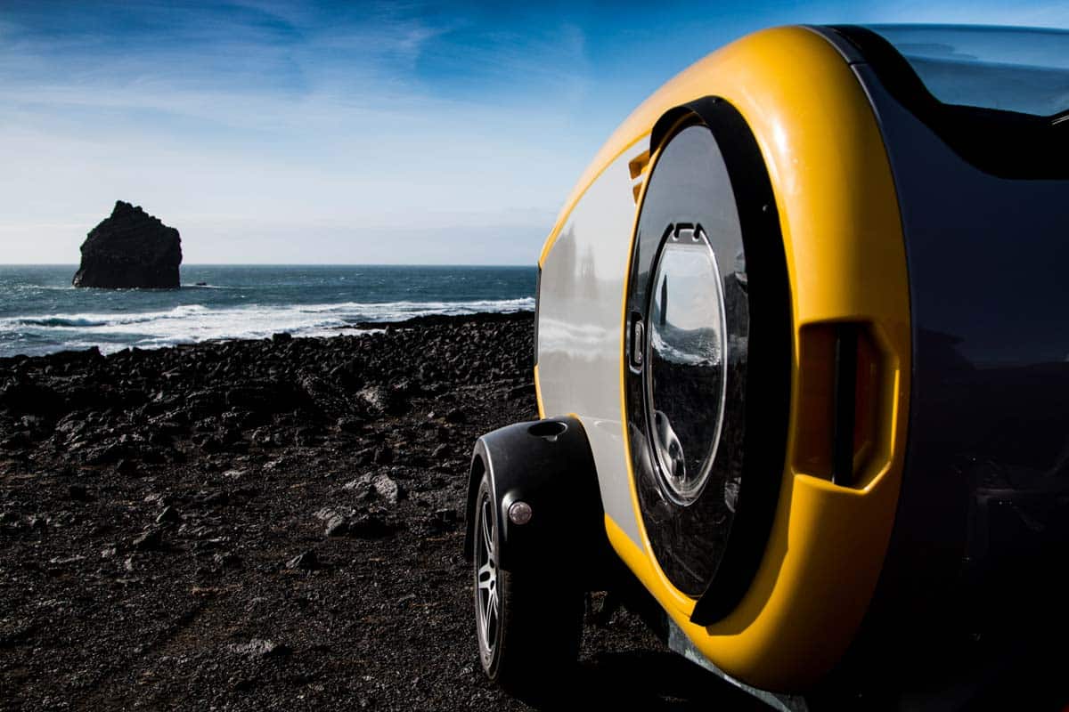 C’est tout d’abord par son esthétique que la Mink 2.0 séduit. Il faut dire qu’avec sa cellule jaune et grise aux courbes élégantes, ses portes arrondies comme des hublots et ses jantes en alliage, la petite islandaise a fière allure. Car, et ce n’est pas sa seul originalité, la Mink 2.0 a vu le jour au pays des volcans. Montée sur un châssis galvanisée Al-Ko qui lui assure stabilité pendant la route grâce à son centre de gravité très bas, la caravane affiche un poids de 520 kg pour un PTAC de 750 kg. Elle pourra donc être tractée par la plupart des voitures. Et sa hauteur de 1,83 mètres lui permet d’aisément passer sous la barre des 2 mètres au péage et donc de bénéficier du tarif de la catégorie 1. L’habitacle monocoque semble solide et prévu pour durer.