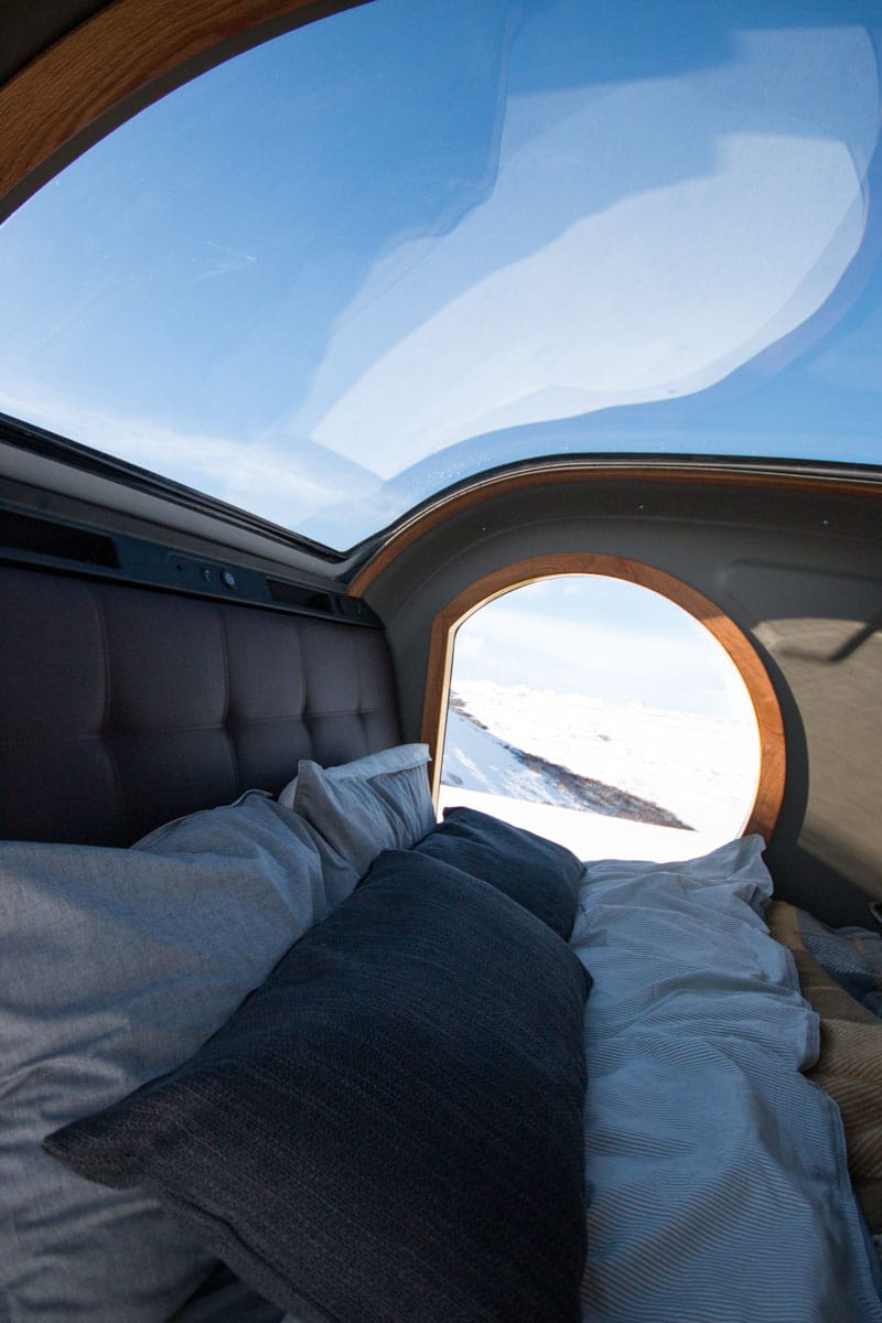 Outre les deux larges vitres latérales, le toit de la Mink est percée d’une large baie vitrée panoramique. Cette dernière offre à la Mink un intérieur très lumineux ainsi que le plaisir d’observer le ciel étoilé la nuit venue. Comme les deux vitres latérales, cette baie vitrée peut être occultée avec des stores.