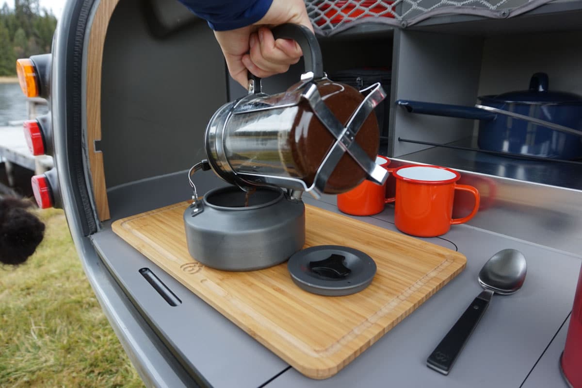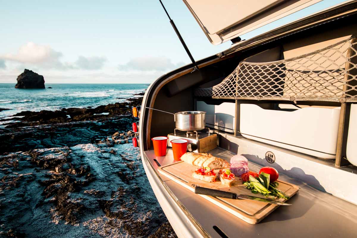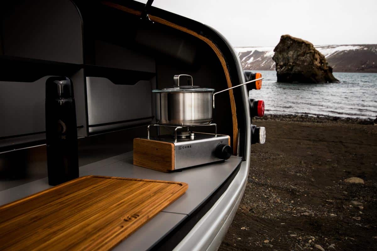 Le matelas en mousse à mémoire de forme est grand et confortable (140×200 cm). Au-dessus du lit, une couchette de 1,40 m x 0,55 m a été conçue pour accueillir un petit enfant. Soyons franc : il est difficile d’imaginer des vacances à 3, même avec un jeune enfant dans la Mink. Une nuit de temps à autre, certes, mais pas de véritable vacances. Cette couchette aura sans doute plus d’utilité comme un rangement supplémentaire que comme un troisième couchage. Ce n’est d’ailleurs pas du superflu. La Mink est en effet limitée lorsqu’il est question de rangement. Il sera nécessaire de garder une partie de vos bagages dans le coffre de la voiture, même si la cuisine dispose de quelques tiroirs. Cette dernière est cachée dans un coffre, à l’extérieur de la caravane. L’espace de travail accueille une glacière intégrée ainsi qu’une mini cuisinière à gaz. Plusieurs branchements électriques permettent de compléter l’équipement de cette cuisine. Bien que la cuisine est en plein air, la porte du coffre servira d’abri en cas de mauvais temps. Avouons le toutefois, s’il remplit bien son rôle s’il ne tombe que quelques gouttes, il ne sera quand même pas très agréable de cuisiner par forte pluie.