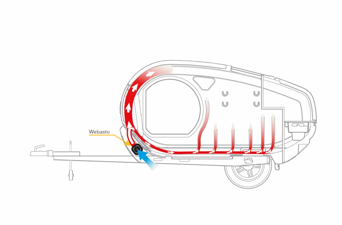 Outre son séduisant design qui la distingue des autres mini-caravanes du marché, la Mink se fait également remarquer par son caractère 4 saisons. Cette caravane venue du froid est en effet prévue pour être utilisée, même en hiver. Les parois de la caravane sont épais de 30 mm, isolée avec 19 mm d’Armaflex, un matériau hautement thermo-isolant. Associées à une bonne couette, les capacités isolantes de ces parois vous mettent à l’abri pendant les fraiches nuits de printemps ou d’été. Toutefois, elles ne seront pas suffisantes pour camper en hiver. La Mink est donc vendue avec un chauffage en option (1490€). Combiné au chauffage, le système de ventilation à double sens de la Mink envoie 70% de l’air chaud dans l’habitacle et 30% de l’air chaud sous le lit ce qui permet d’éviter la condensation et vous garder au chaud pendant la nuit. Cette ventilation permet à l’air de glisser sur la caravane lorsqu’elle est en route alors qu’à l’arrêt l’air circule librement à l’intérieur. Sans pour autant amener de pollen ou de poussière grâce à un système de filtration. Les commandes pour le chauffage sont intégrées à la tête de lit.