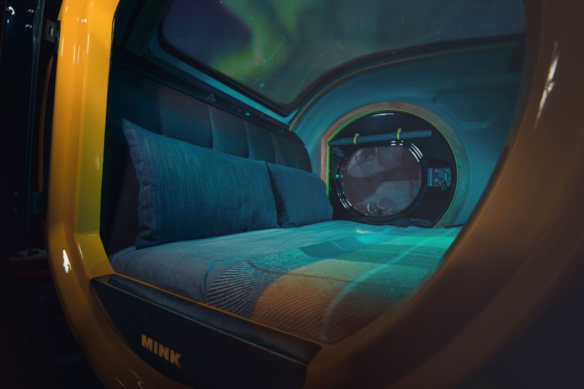 L’intérieur de la caravane ne comporte bien évidemment pas de salon, ni de cuisine. Juste un lit 2 places. La tête de lit en simili-cuir permet toutefois de s’y adosser et de s’assoir. L’éclairage d’ambiance LED s’étend sur les deux côtés de la Mink et une prise de courant est disponible au milieu de la paroi arrière. Elle est complétée par 4 ports USB pour recharger vos téléphones et tablettes.