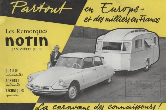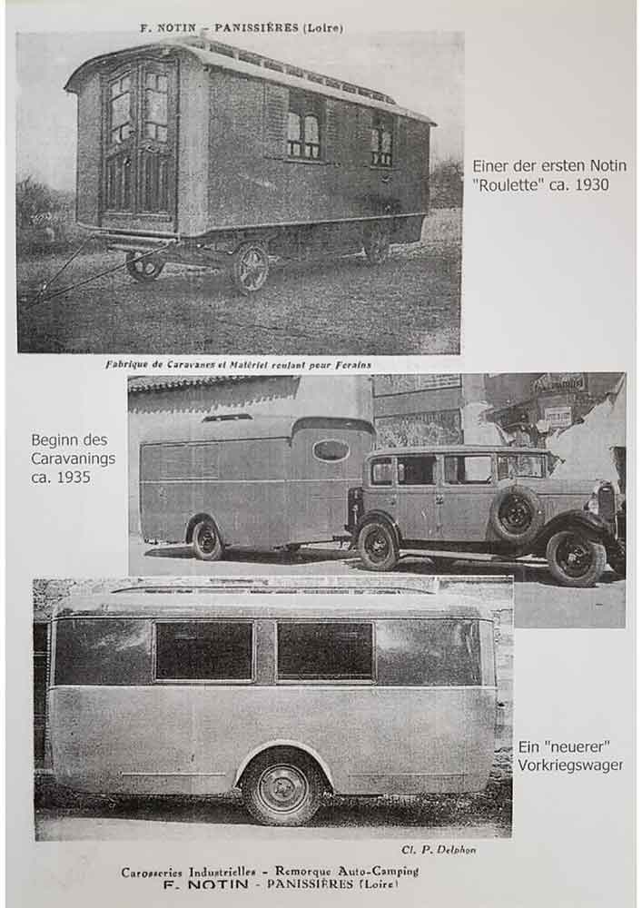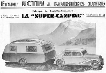 Mais revenons aux origines de Notin. Francis Notin construit à partir de 1921 des remorques d’habitation foraines, d’abord à traction animale, puis, à partir de 1928, automobile avec son frère Joseph. En 1933, les frères Notin créent une caravane de tourisme à la demande d’un avocat de Nice. Ce modèle s’écarte de la roulotte grâce à sa porte latérale et non arrière, tout comme elle adopte des lanterneaux, vecteurs de lumière et d’air frais. Les vitres descendent dans les parois. En 1934, Joseph Notin rachète l’atelier à son frère et se consacre à la remorque de camping. C’est le premier constructeur à exposer à la foire de Paris en 1935.