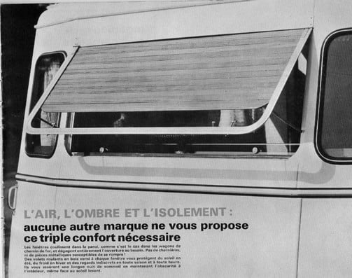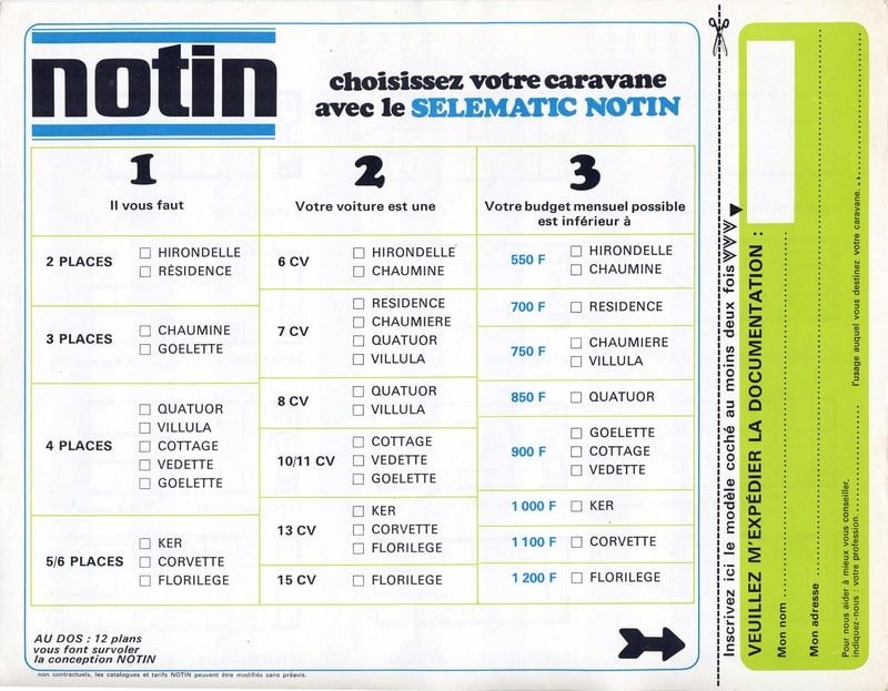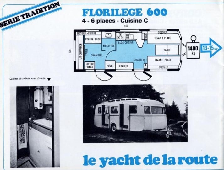 [quote align=’left’]« Le Living-car Notin vous apportera le confort et le raffinement qui ont fait la réputation des caravanes NOTIN. Il vous procure ne plus une autonomie complète sans l’obligation d’un permis spécial. L’habitabilité en marche accroît votre confort et votre rapidité de déplacement ; la partie résidentielle toujours en communication avec la cabine reste utilisable pendant le parcours. Les passagers peuvent à leur gré, circuler, lire, travailler, se reposer sans qu’il soit nécessaire d’arrêter le véhicule. En cas de pluralité des conducteurs, l’un peut dormir confortablement dans un lit pendant que l’autre pilote ; votre rayon d’action s’en trouve ainsi multiplié. Il n’y a pas de problème de stationnement pour le Living-car qui se gare comme une voiture de tourisme (parking, chaussée)[/quote]