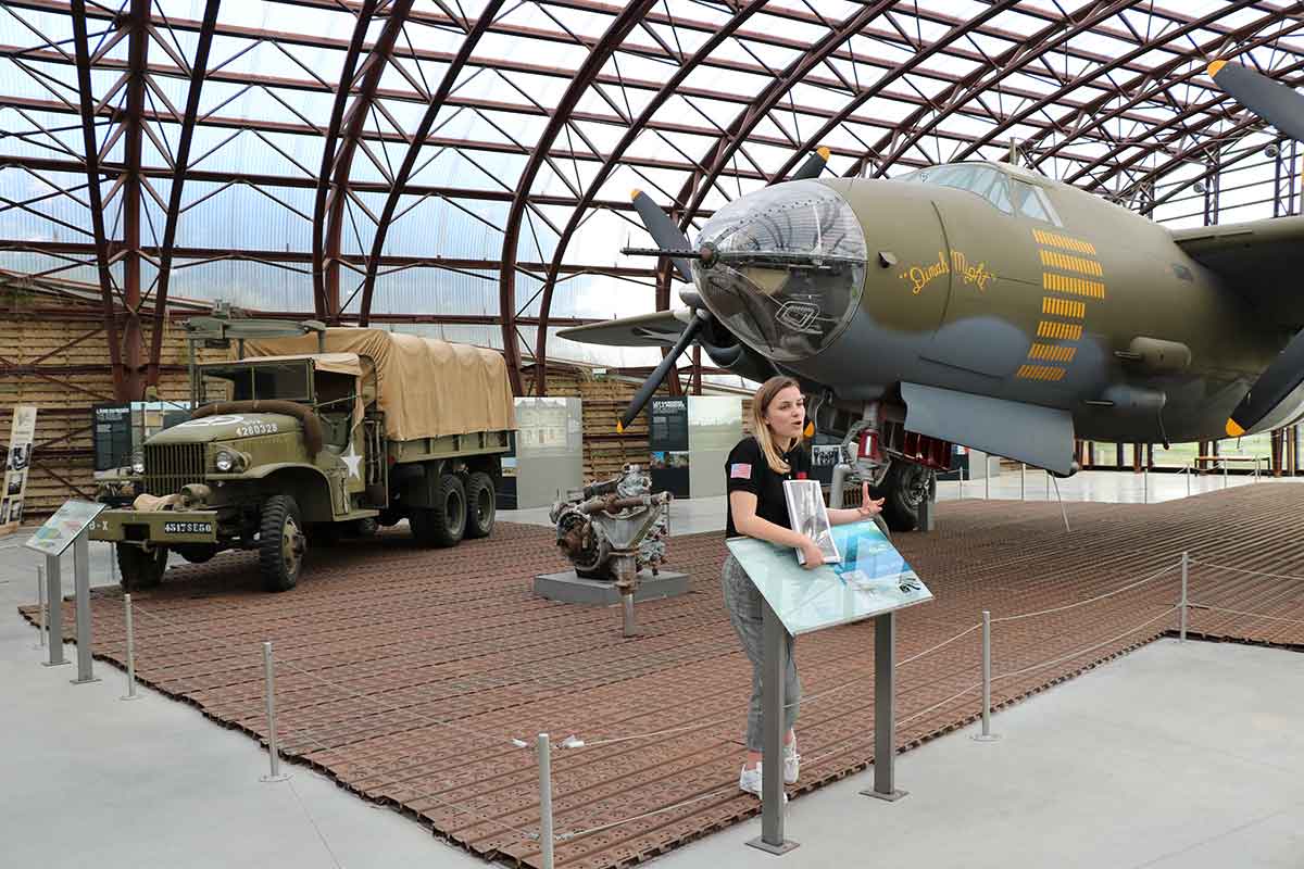Point d’orgue de la visite du D-Day Experience qui revient sur le débarquement des parachutistes américains, le parcours immersif qui vous fait revivre une traversée de la Manche en 1944 à bord d’un C-47. Vous voilà dans la peau d’un parachutiste en route pour la Normandie. Alors que l’avion vibre au rythme des moteurs, vous découvrez à travers les hublots l’armada de bateaux en route pour le continent.