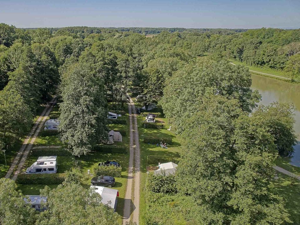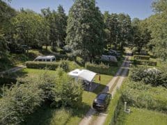 Le camping propose plusieurs allées parallèles, disposées en étage, distribuant les emplacements. Ils sont tous parfaitement délimites par des haies pour garantir l’intimité. Le terrain est partiellement boisé, laissant ainsi certains emplacements ensoleillés et d’autres ombragés naturellement. Une vingtaine d’emplacements ont une surface stabilisée pour camping-cars. Une borne équipée en électricité, arrivée d’eau et évacuation se trouve forcément à proximité de l’emplacement. Un étang où l’on peut pêcher, longe le camping, offrant une situation bucolique.