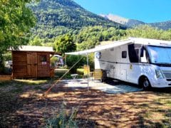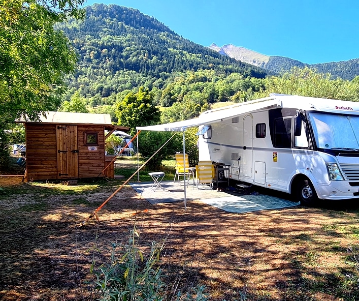 Emplacements plats, herbeux et paysagers de 100 m² en moyenne, avec vue sur les montagnes ou le village, répartis de part et d’autre de l’allée principale de camping et entourant la plaine de jeux centrale.
