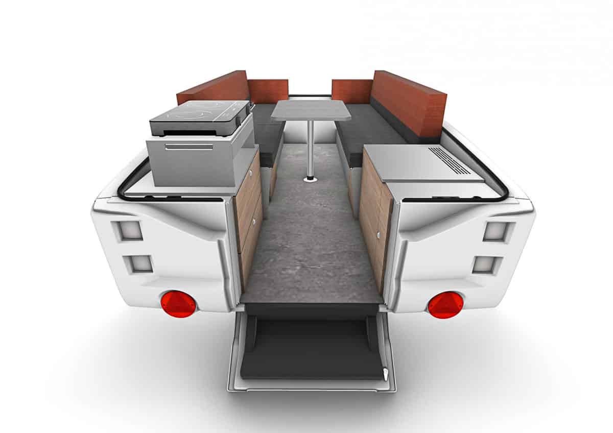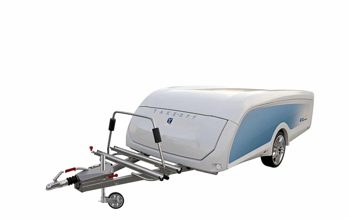 La TakeOff possède les avantages de toutes les caravanes pliantes : la facilité de traction et la légèreté (son poids à vide est de 550 kg), le tout associé avec une intéressante surface une fois la caravane déployée. Il est donc possible de la tracter avec des véhicules compacts et même des voitures électriques. Ce qui la distingue des autres caravanes pliantes du marché c’est son caractère hybride. Avec ses parois semi-rigides, cette caravane se veut un compromis entre une caravane classique et une caravane pliante. Son système de dépliage est très simple, ce qui permet de déployer la caravane en moins d’une minute. Un peu plus si vous choisissez de la compléter avec un auvent. Les parois de la TakeOff disposent de grandes fenêtres qui lui permettent d’être parfaitement ventilée. Ces fenêtres peuvent bien évidemment être occultées pendant la nuit.