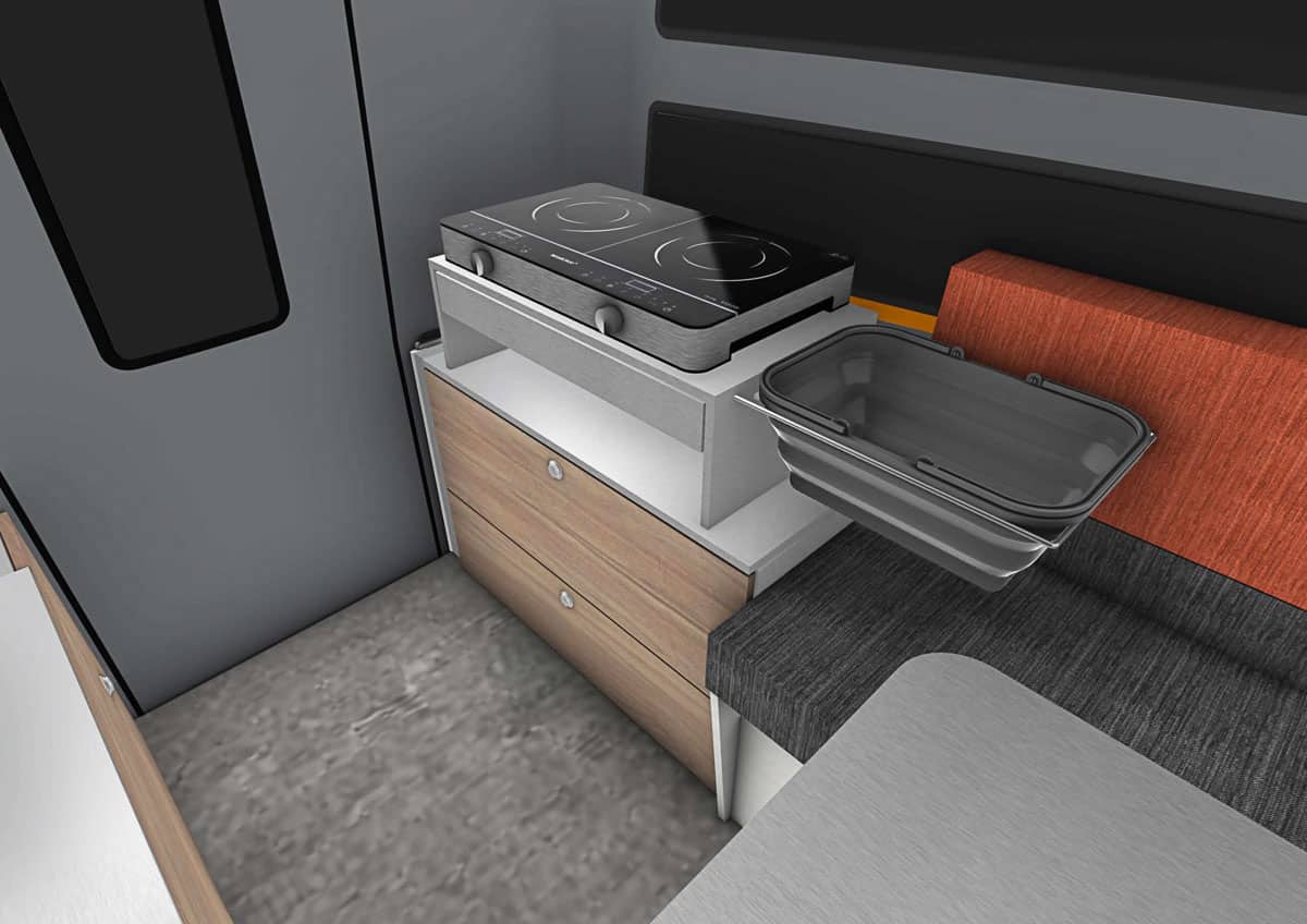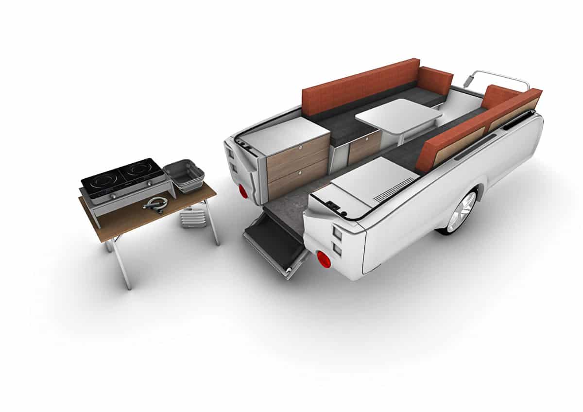 Pendant la journée, la TakeOff vous propose un espace salon avec deux canapés séparés par une table. Sa cuisine est amovible (version TakeOff Sport et Xcite). Suivant la météo ou vos préférences, vous pouvez choisir de l’utiliser à l’intérieur de la caravane ou à l’extérieur. Lorsqu’arrive la nuit, les deux canapés se transforment en un lit aux dimensions confortables : 160 cm x 205 cm.