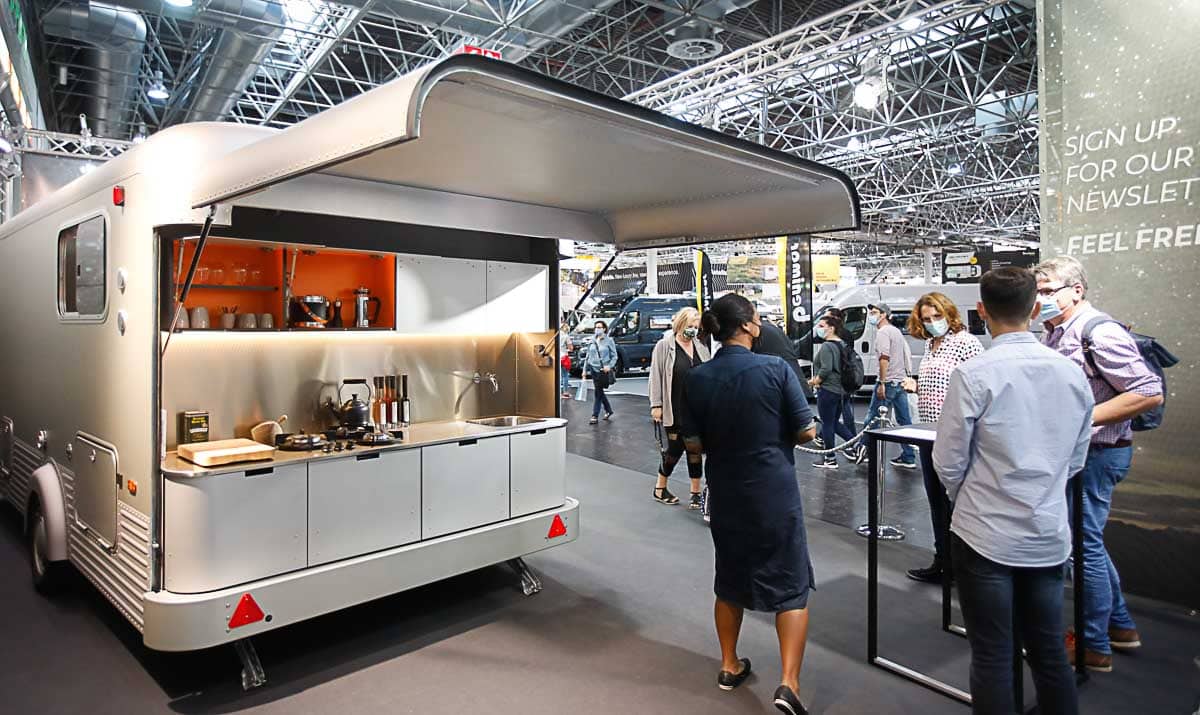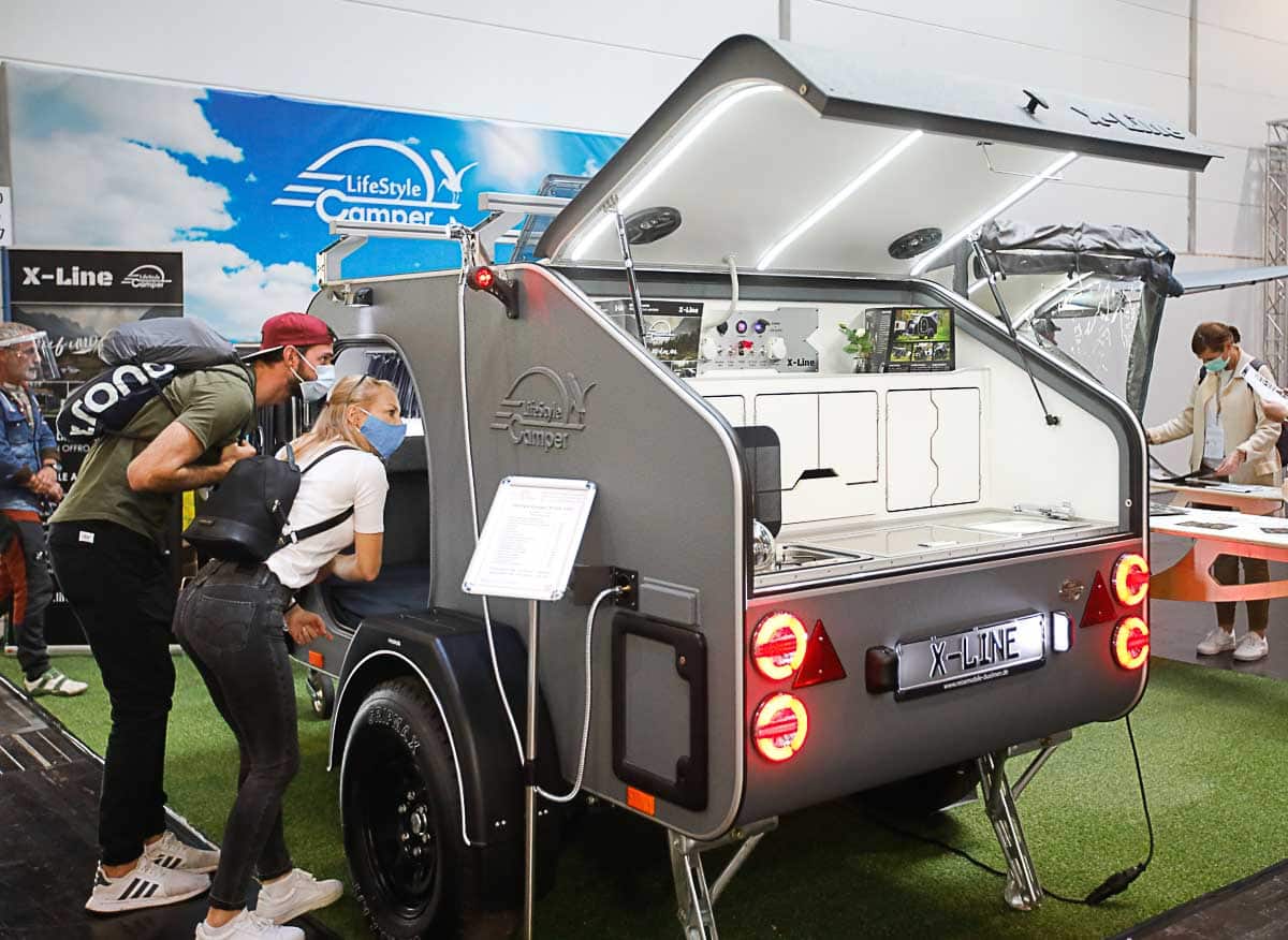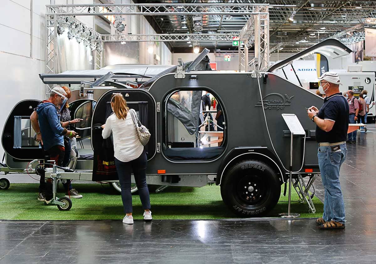 Côté caravanes, tentes et camping-car, le salon a présenté toutes les nouveauté des principales marques (hormis le groupe Hymer, bien sûr). Si on a pu admirer des camping-cars de très grande taille, la tendance de cette édition 2020 serait plutôt au petit gabarits avec un vrai succès des tear drops et des mini caravanes ainsi une place de plus en plus importante occupée par les vans. Le salon aura également été l’occasion de découvrir quelques modèles originaux comme le camping-car en bois de Holzmobil auquel nous avons déjà consacré un article ou le Lume Traveler venu des Pays-Bas dont l’esthétique rivetée s’inspire des Airstream (nous reviendrons bientôt plus en détail sur ce modèle). De son côté, la marque Knauss – Tabbert célébrait ses 60 ans et les 100 de son créateur avec un stand qui exposait une déclinaison de ses modèles historiques jusqu’à ses modèles les plus contemporains. L’occasion de présenter des caravanes concept. Notamment une variation avec une paroi latérale qui se déplie pour se transformer en terrasse (voir photo ci-dessous). L’idée est séduisante, mais difficile à imaginer sur un terrain de camping avec des voisins.