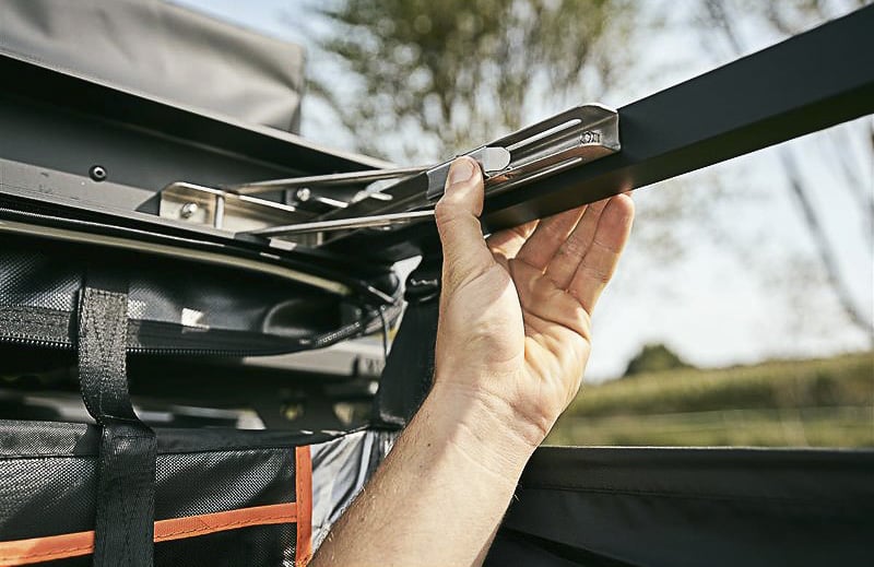 À l’occasion de cet article, nous avons pub tester la Cumaru 135, un des modèles de tentes rigides proposées par la marque allemande. Facile à installer sur le toit de la voiture (comptez tout de même 3 personnes pour la hisser sur le toit), elle est également très rapide à déployer comme vous pouvez le voir sur la vidéo. De conception qualtitave, elle s’ouvre et se ferme sans effort grâce aux vérins à gaz. À noter que sur la version light, vous pouvez ajouter des barres transversales sur la coque de la tente. Ceci permet d’emporter des charges supplémentaires telles que des vélos ou des planches de surf. À condition, bien sûr, que vos propres barres de toit autorisent ce surplus de poids.